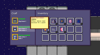 Stargone is a small farming game set in a biopunk world and inspired by Stardew Valley and the timer system of Clash of Clans. You're stuck on a spaceship, all alone...or so you think. You managed to rescue the only earthly tree still alive, and you must find a way to keep it that way! Of course, nutrients are hard to find, but what if you can make use of these alien plants you've found while on your journey?